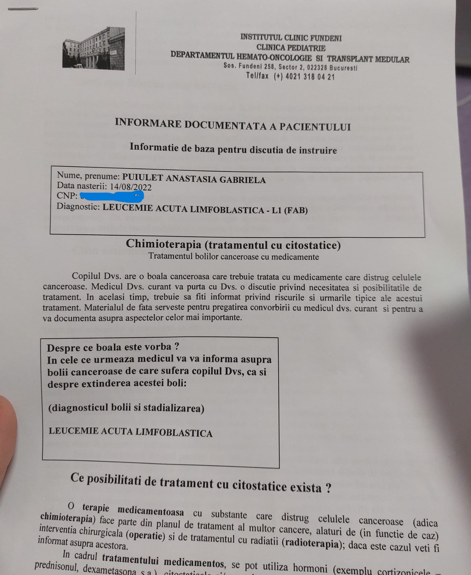 Ne-au trimis la Fundeni, iar aici, în urma investigațiilor și a unei puncții, fetiței noastre i s-a pus diagnosticul: leucemie acută limfoblastică -L1.Un cancer al celulelor sângelui. Începem, așadar, un șir lung de proceduri medicale, unele dureroase, pentru a stopa evoluția bolii”, na povestit Mădălina, mama micuței, pentru observatorulph.ro.