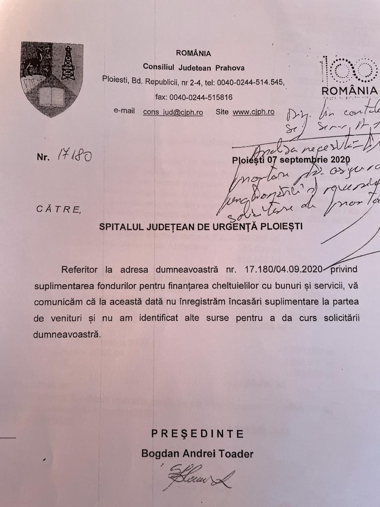 Dovezile refuzului finanțării Spitalului Județean de Urgență Ploiești, de către Bogdan Toader -FOTODOCUMENTE