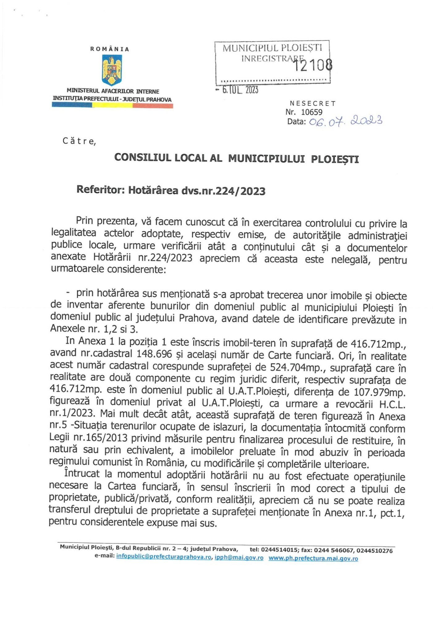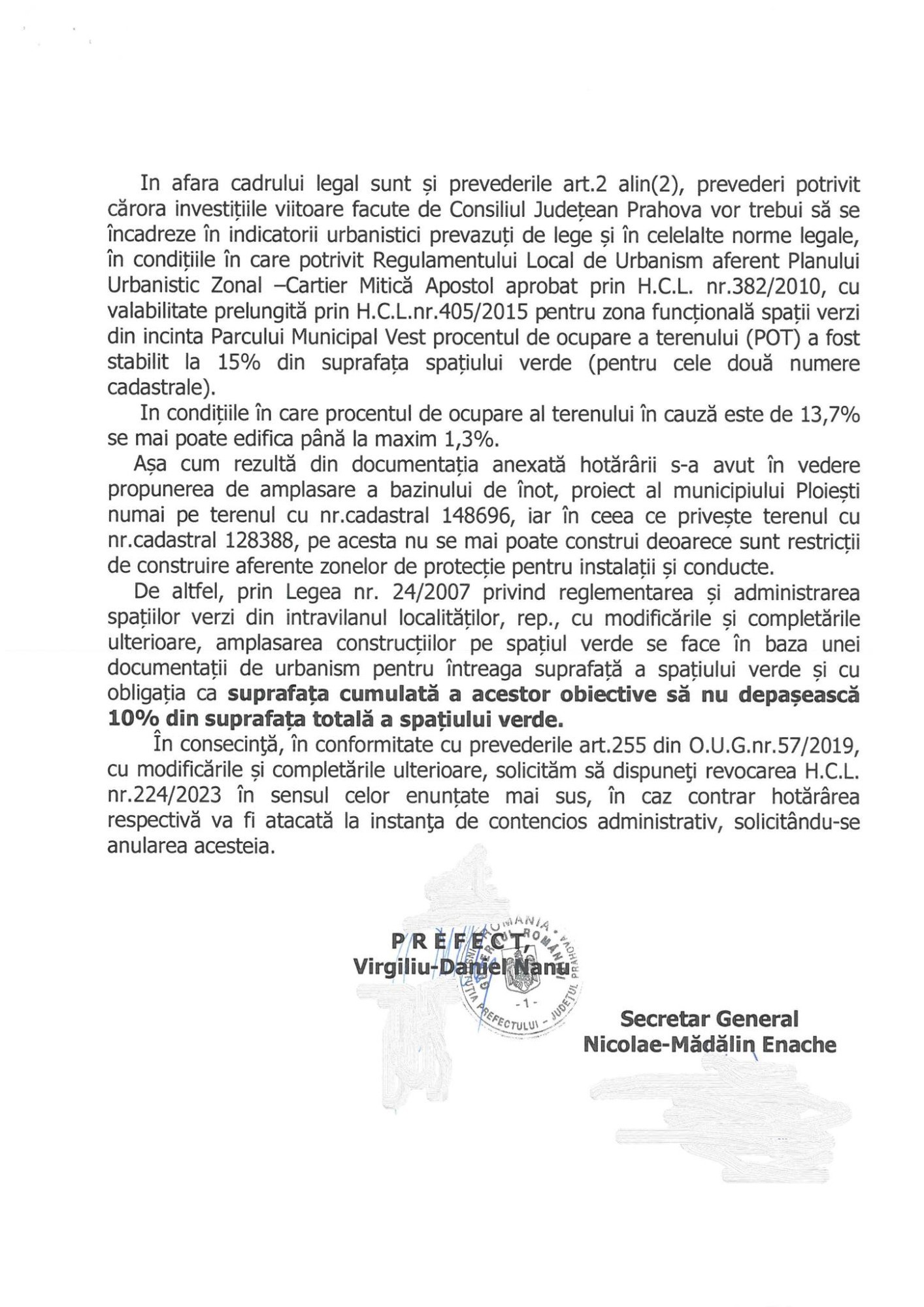Juriștii Prefecturii au considerat că sunt probleme legate de dezmembrarea terenului și înscrierea construcțiilor în Cartea funciară, de tehnica legislativă și de procentul de ocupare a terenului, în condițiile în care vorbim despre spații verzi.