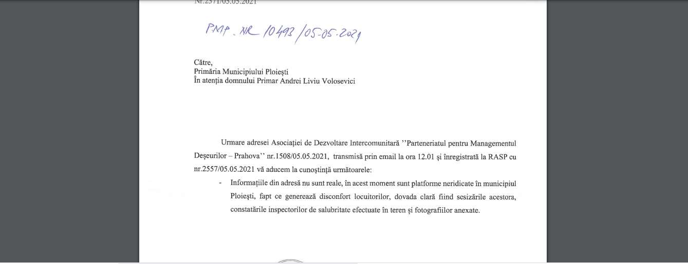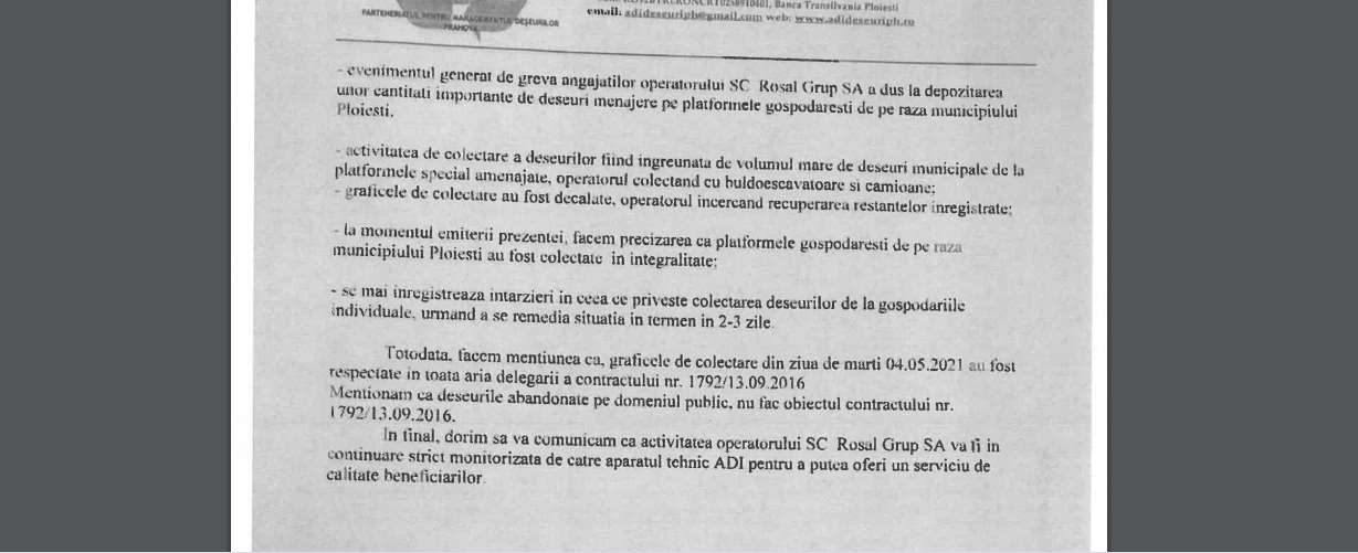 Autorităţile ploieştene au ataşat la comunicat atât adresa oficială primită din partea ADI Deşeuri, cât şi replicile transmise de Spitalul Municipal şi Regia Autonomă de Servicii Publice, în care ambele instituţii reclamă că nu s-a ridicat gunoiul în mod corespunzător şi că, implicit, datele trimise de ADI sunt incorecte.